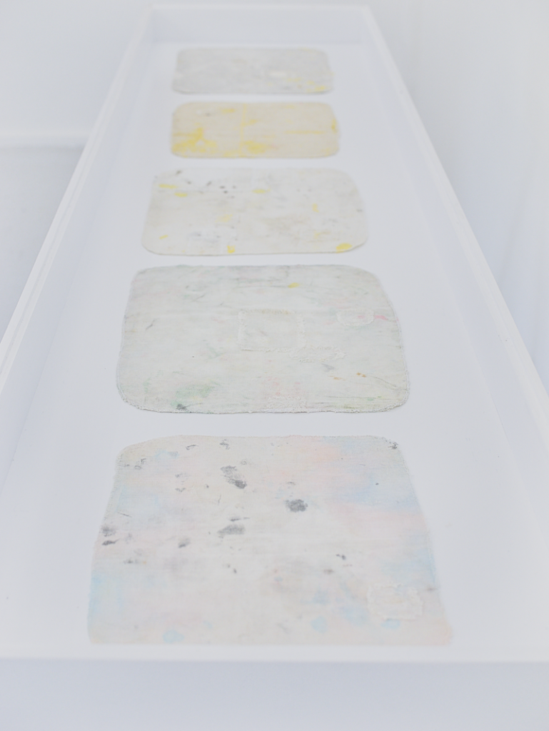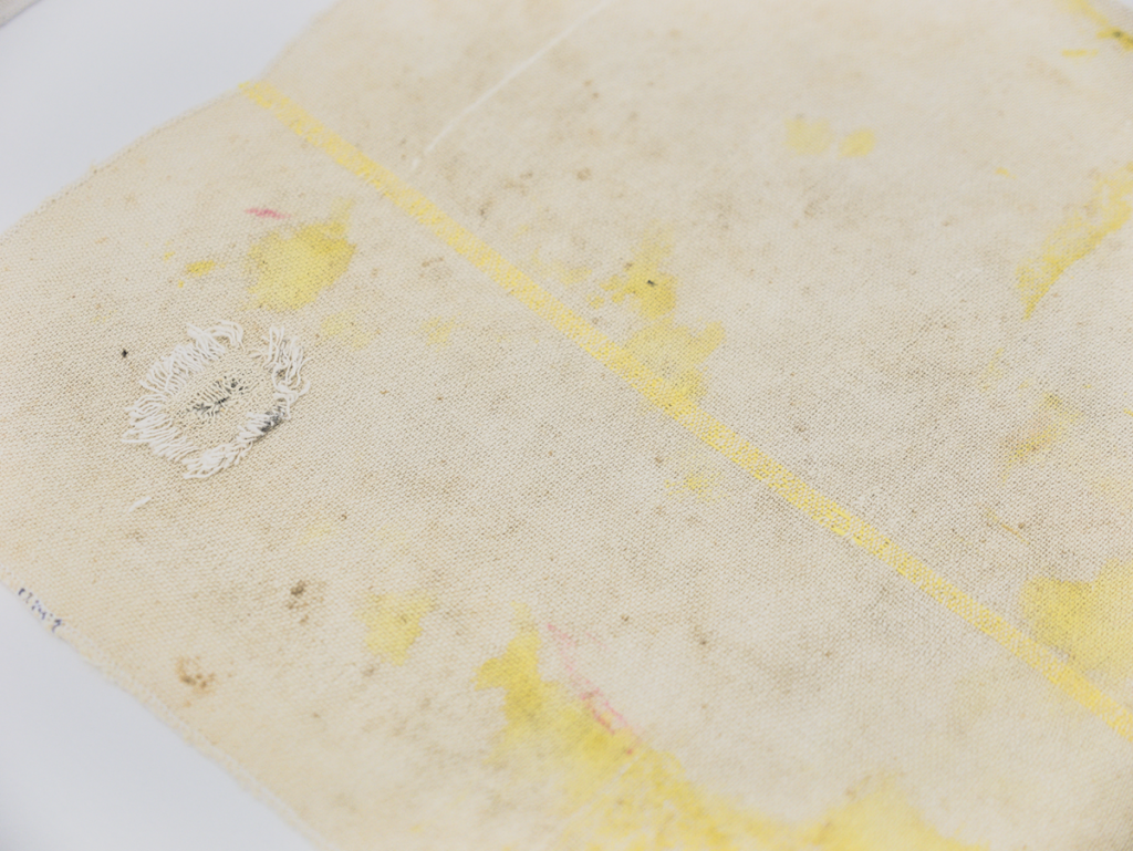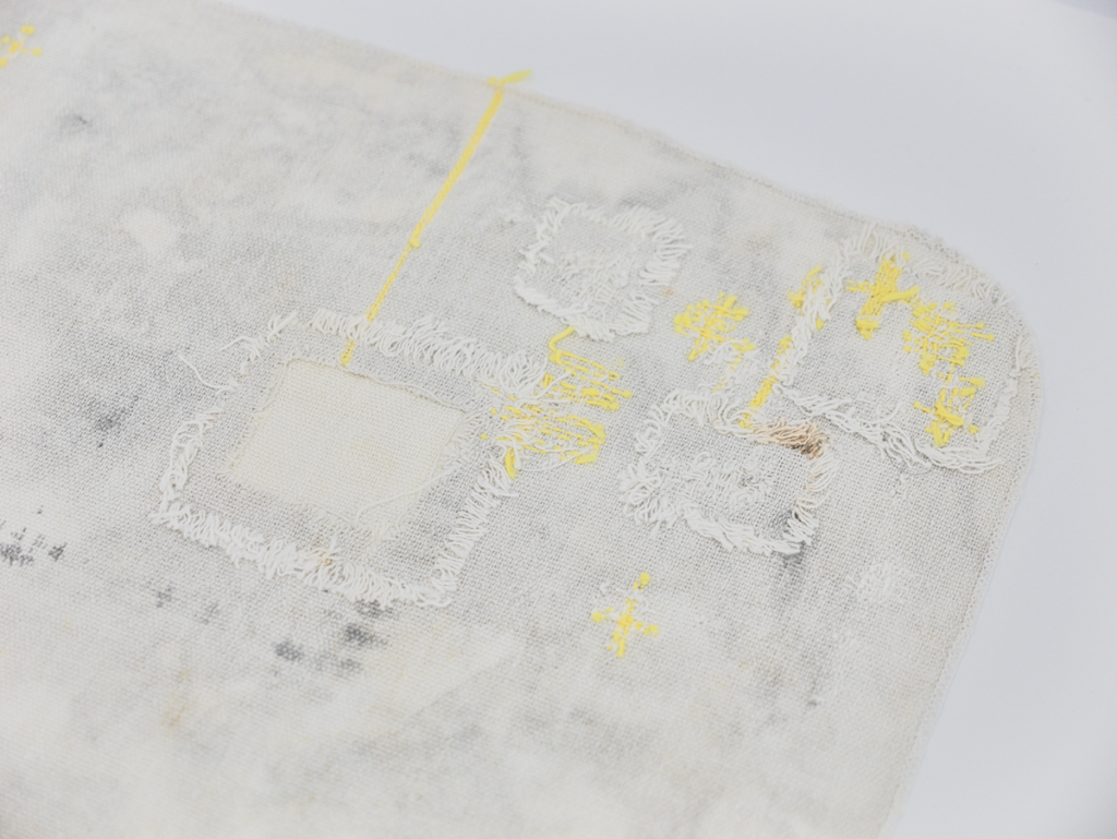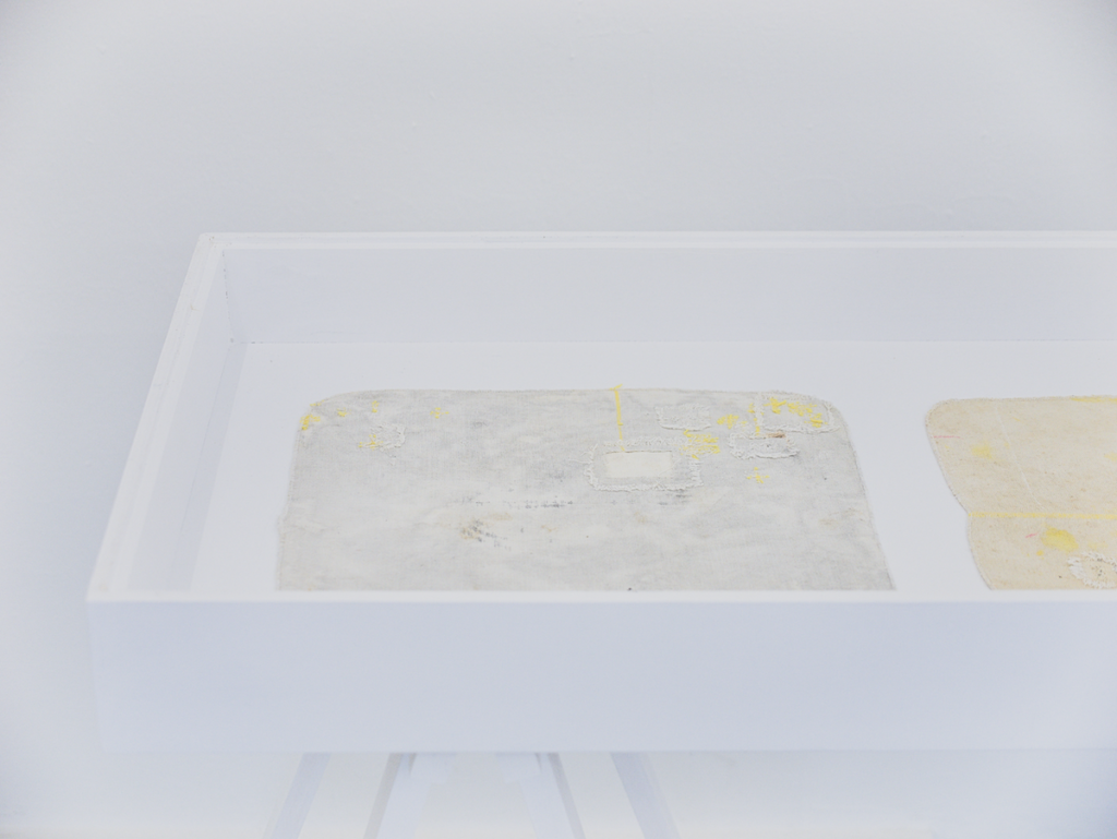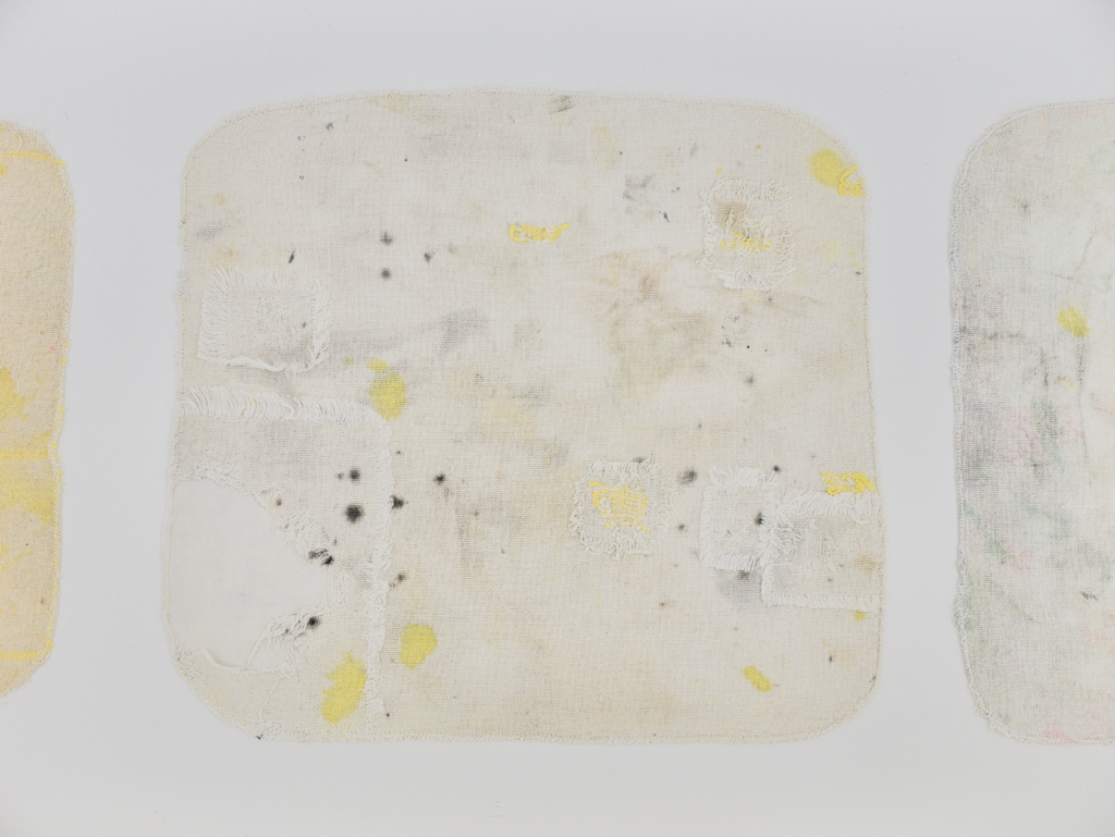 Maria Isabel Arango presents a series of stitchings on cotton cloths using a traditional technique called zurcido, that she was taught as a ch ild by nuns at Catholic school in Medellin in Colombia, in the 1980s. The works are created in a craft club in the Envigadoneighborhood in Medellín, along with Gabriela Pérez and Cristina Posada, two elderly women, and with Maria Cecilia Velásquez, the artist’s mother. The zurcido technique was originally used to mend broken garments –before serial mass production of cheap clothing–, yet the artist and her collaborators use it to create abstract forms, alluding to domesticity, leisure time and forms of care among women.