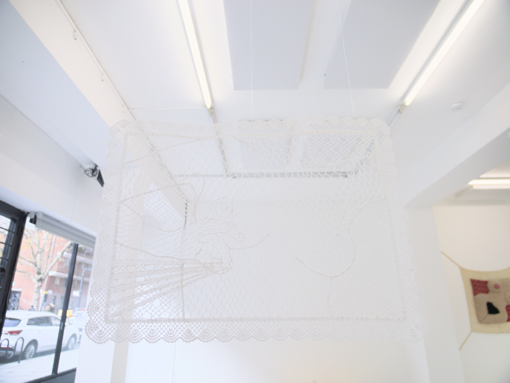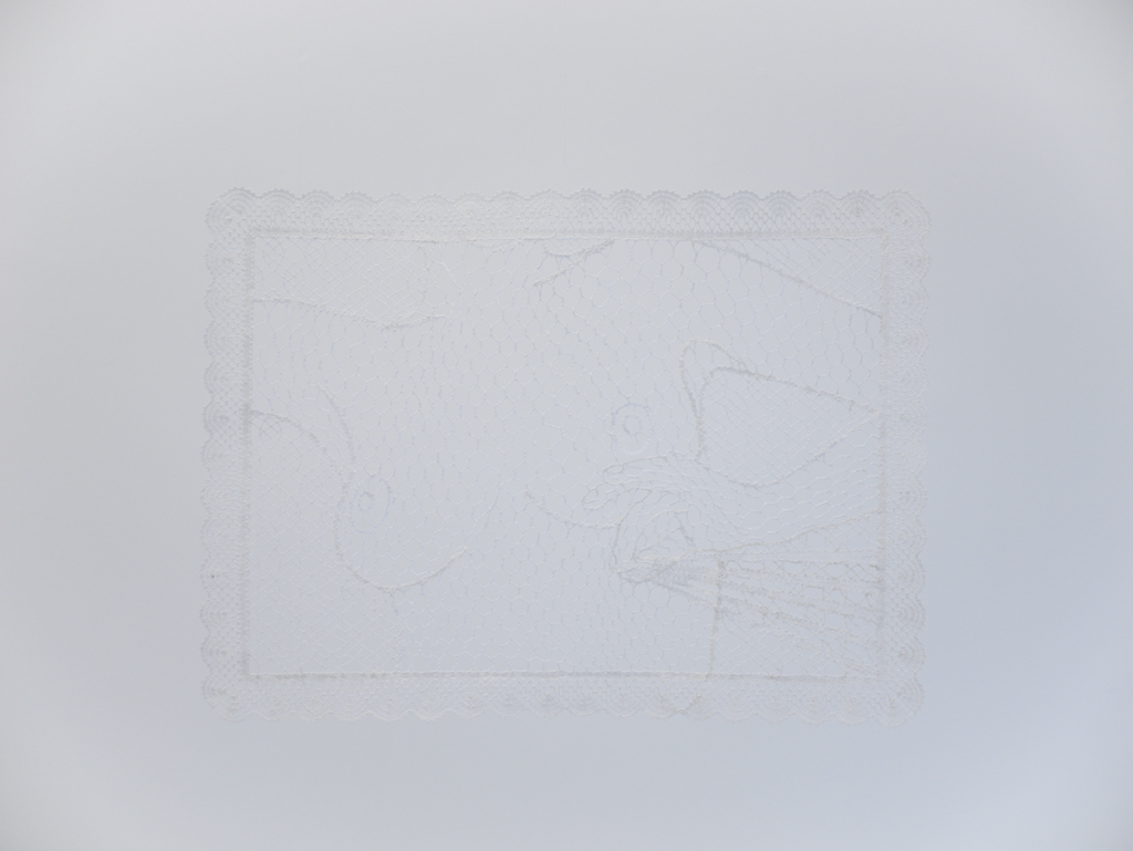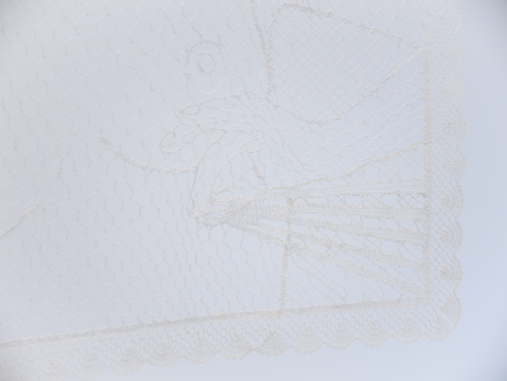 Alicja Biala works in collaboration with lace master Maria Voelkel-Brukwicka in Poznan–her hometown in Poland– creating delicate pieces with explicit sexual imagery, thus inciting a witty dialogue with the diverse historical uses of lace in European culture. Biala depicts her grandmothers, her mothers and her own breasts in the works, granting intimacy and some degree of humour to the dynamics around their creation.